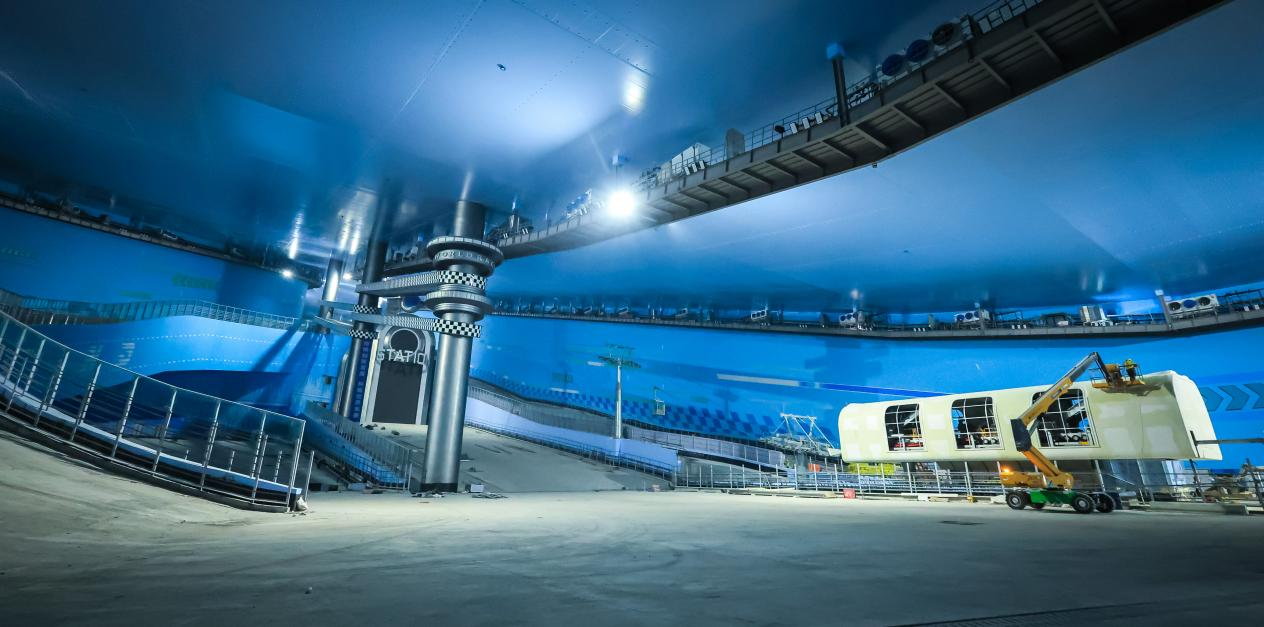 盡管室內(nèi)滑雪場(chǎng)仍在施工中,但嶄新的雪具大廳已經(jīng)進(jìn)入裝修的最后階段,分布在墻上和頂棚的藍(lán)色光帶營(yíng)造的雪花造型,給人以強(qiáng)烈的視覺(jué)沖擊。進(jìn)入到滑雪場(chǎng)內(nèi)部,四條不同等級(jí)的雪道顯露真容,拖掛式纜車的核心設(shè)備已安裝到位,空中纜線基本鋪設(shè)完成。