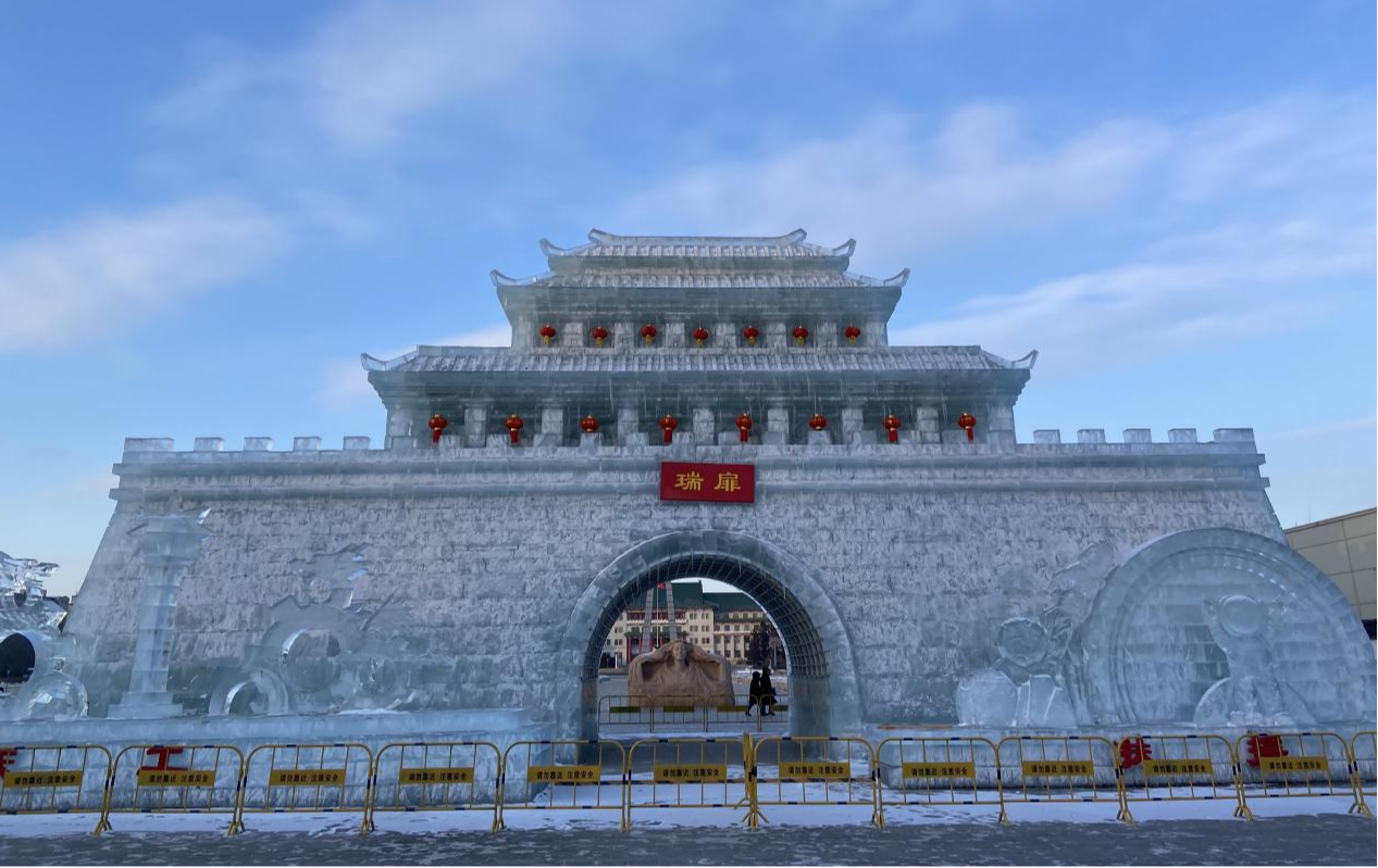 當(dāng)來自深圳的大學(xué)生張濤宇走出地鐵站來到長(zhǎng)春市文化廣場(chǎng),就被眼前恢弘的“瑞扉之門”所震撼,他摘下冒著熱氣的手套,輕輕觸摸冰面,感受這座陌生城市豐富的歷史文化底蘊(yùn)。