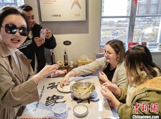 圖為外國(guó)留學(xué)生在山東煙臺(tái)學(xué)習(xí)包鲅魚(yú)水餃!≈行律缬浾 李長(zhǎng)亮 攝