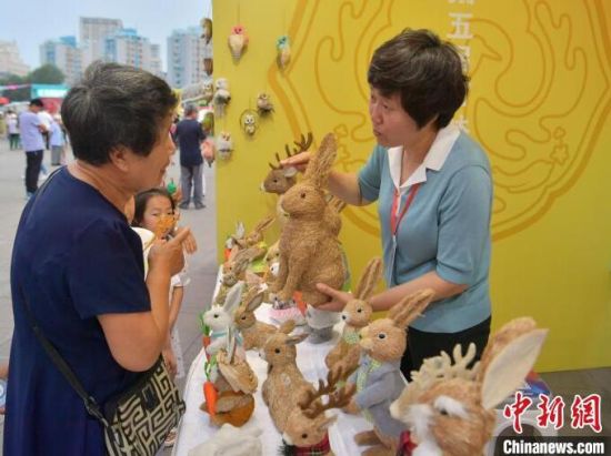韓氏草編第五代傳承人閆莉(右一)與顧客交流。