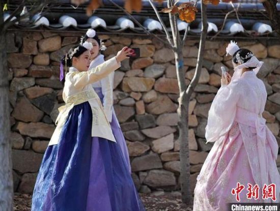 11月4日,在吉林省延邊朝鮮族自治州延吉市的中國朝鮮族民俗園內(nèi),游客身著朝鮮族服飾拍照留念。延邊是中國最大的朝鮮族聚居區(qū),濃郁的民族風(fēng)情吸引大量游客前來觀光體驗。