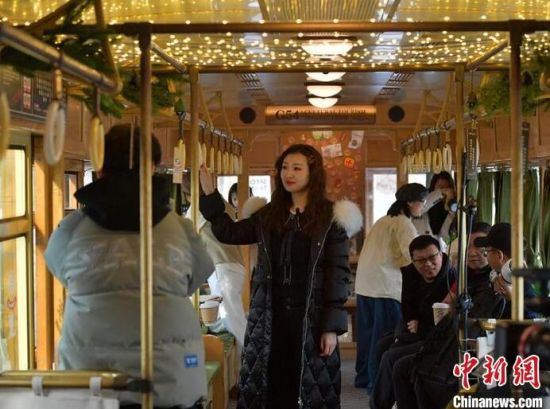 1月8日,吉林長(zhǎng)春,一輛54路有軌電車文旅專列吸引游客打卡拍照。該專列外形復(fù)古,車廂布置獨(dú)具特色,游客預(yù)約后可購(gòu)票乘車體驗(yàn)車內(nèi)及市區(qū)沿線的人文風(fēng)情。