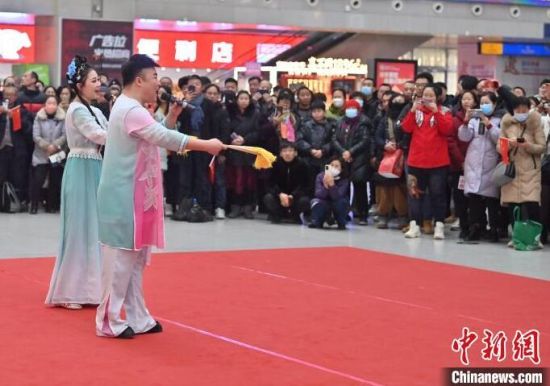 1月26日,在長春站候車大廳,長春站、沈陽鐵路公安局長春公安處等多個部門聯(lián)合為旅客帶來了系列精彩表演, 吸引大批過往旅客駐足觀看、參與。當天,2024年春運啟動。2024年春運自1月26日開始至3月5日結(jié)束,為期40天。春運期間,長春站預(yù)計發(fā)送旅客341萬人次,日均8.5萬人次。(完)