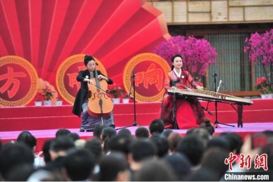 歌手呂薇在演唱《綠水青山》。舞蹈演員們在為歌曲《喀秋莎》伴舞。舞蹈演員們在表演群舞《鼓繡春色》。大提琴和伽倻琴器樂合奏《如愿》。歌手保劍鋒和伍珂玥在演唱《天之大》。