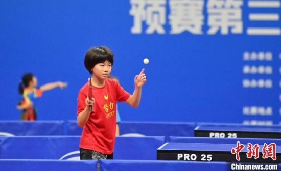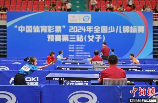 8月6日,吉林長春,選手在比賽。當天,2024年全國少兒乒乓球錦標賽預賽第三站(女子)在長春開賽,來自全國47個代表隊的少兒乒乓球運動員同場比拼球技。(中新社記者 張瑤 攝)