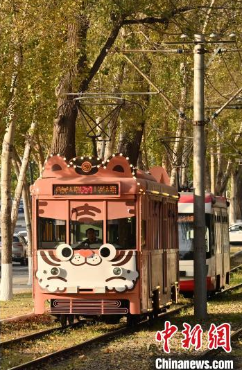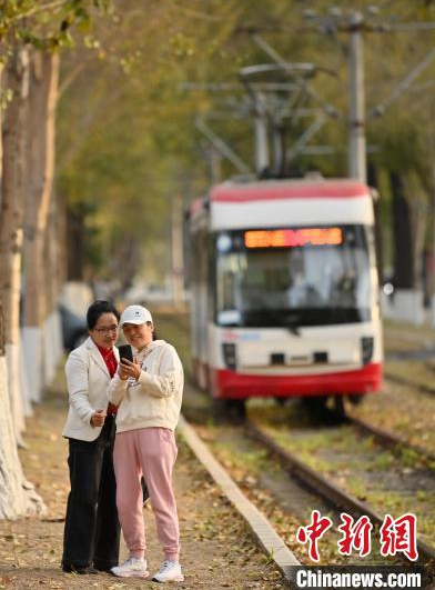 10月9日,吉林長春,一輛有軌電車在泛黃的樹木中行駛,呈現(xiàn)出別有韻味的秋季景致,吸引游客打卡。中新社記者 張瑤 攝