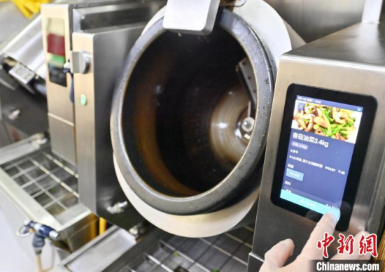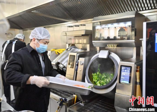 2月11日,吉林長(zhǎng)春,工作人員在智慧敬老食堂操作炒菜機(jī)器人進(jìn)行烹飪。據(jù)了解,在這個(gè)智慧敬老食堂用餐的老年人不僅能品嘗到由炒菜機(jī)器人制作的菜品,還能通過取餐通道旁邊的電子屏幕查看菜品的營(yíng)養(yǎng)成分等信息。中新社記者 張瑤 攝