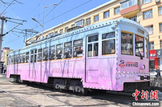 4月18日,吉林長春,游客在54路文旅春日限定專列上拍照留念。該專列車廂內(nèi)外融入了桃花的設(shè)計元素,營造出濃郁的春意,吸引了眾多游客前來打卡。中新社記者 張瑤 攝