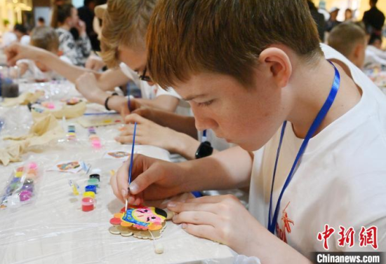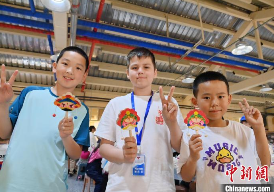 6月14日,吉林長春,俄羅斯青少年在展示京劇臉譜。當天,“感知吉林·青春同行”2025中俄青少年文化交流系列活動在長春啟動。近 200 名中俄青少年參與京劇臉譜繪畫、制作魚皮畫等活動,感受中國文化科技魅力。中新社記者 張瑤 攝