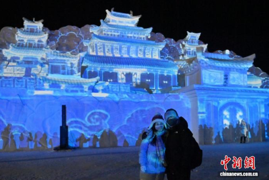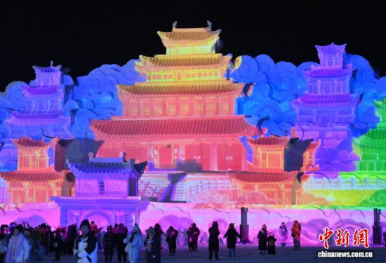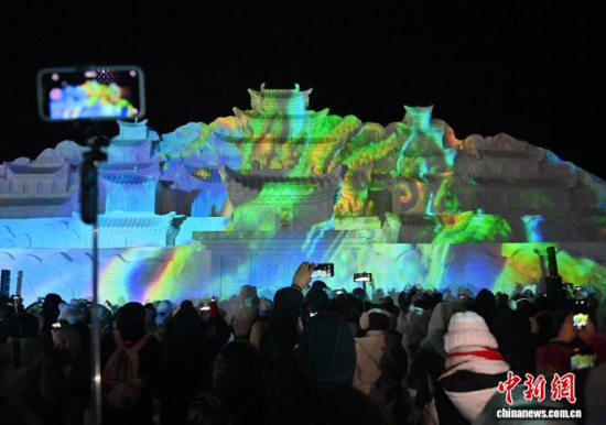 12月26日晚,吉林長白山,新落成的高30米、寬70米、用雪量10萬立方米的雪雕版“云頂天宮”正式點(diǎn)亮。這座以探險(xiǎn)題材小說《盜墓筆記》為藍(lán)本雕琢的冰雪地標(biāo)廣受書迷關(guān)注。中新社記者 張瑤 攝