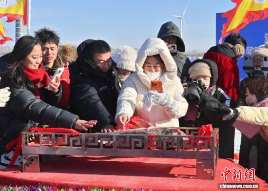 1月8日,吉林·松原查干湖第24屆冰雪漁獵文化旅游節(jié)開幕。當天,在查干湖湖面上舉行的“頭魚”拍賣儀式上,“頭魚”拍出了1699999元人民幣。 中新社記者 張瑤 攝