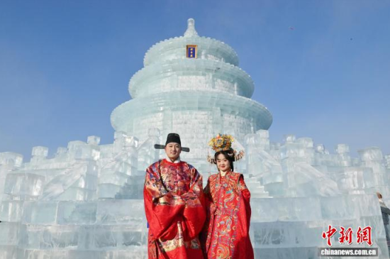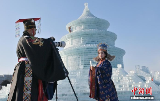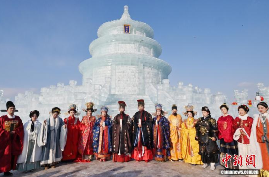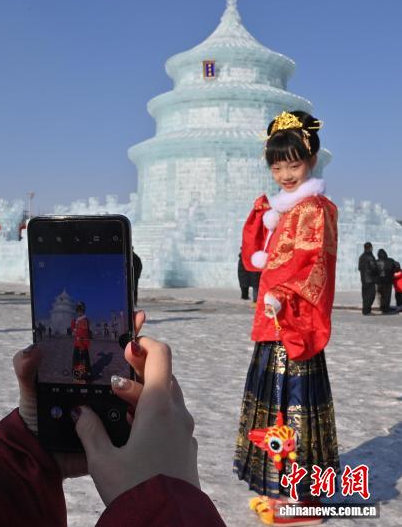 1月24日,長(zhǎng)春市文化廣場(chǎng)上,眾多漢服愛(ài)好者齊聚巨型冰雕“祈年殿”前拍照留念。該冰雕以北京天壇為原型,通體晶瑩,飛檐斗拱皆現(xiàn)冰雪之韻。衣袂飄飄的漢服身影與剔透冰雕相映成趣。中新社記者 張瑤 攝