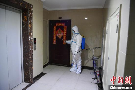 工作人員正在公共區(qū)域進行消殺作業(yè) 張瑤 攝