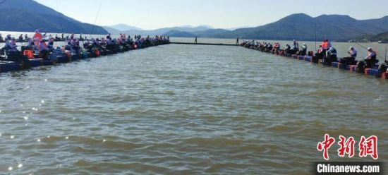 吉林市松花湖管理局漁業(yè)管理處處長(zhǎng)穆超介紹,比賽時(shí)長(zhǎng)6個(gè)小時(shí),3小時(shí)換一次釣位。湖面下放置網(wǎng)箱,魚竿限長(zhǎng)5.4米,非常考驗(yàn)選手使用餌料、控魚等技巧。