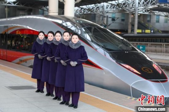 1月4日,在長春站站臺(tái),列車乘務(wù)人員與“智能復(fù)興號(hào)”動(dòng)車組拍照留念。李鵬博 攝