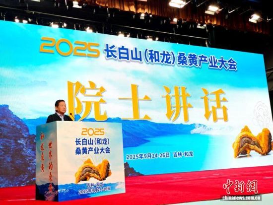 2025長白山(和龍)桑黃產(chǎn)業(yè)大會25日在吉林省和龍市開幕,圖為中國工程院院士李玉正在致辭。