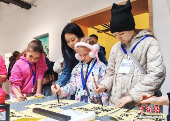 俄羅斯青少年在體驗書法。李彥國 攝
